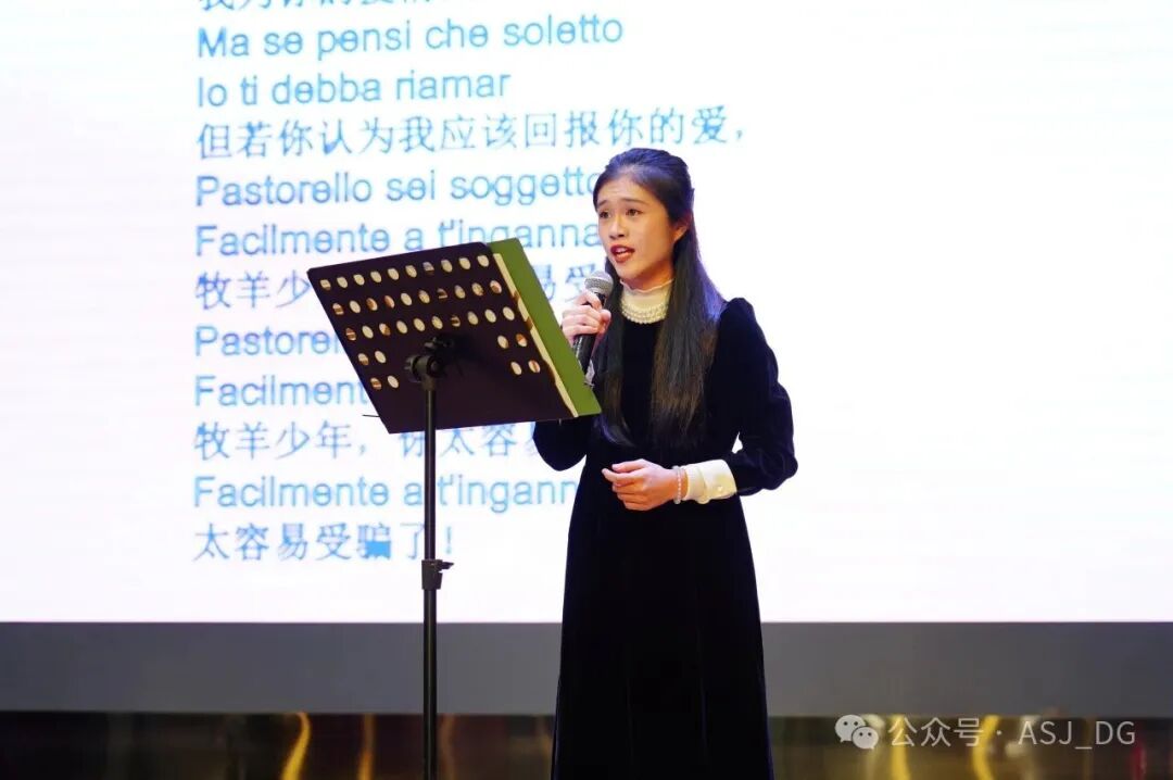 音乐会上,青年歌唱家们精彩演绎了亨德尔歌剧中的悲怆咏叹《让我痛哭吧》、勃拉姆斯的诙谐小曲《徒劳小夜曲》,以及贝多芬深情款款的《我爱你》等多首经典作品。每一首曲目都展现了不同音乐时期的独特风格,让在场师生深深沉醉其中。