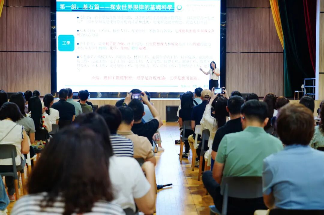 随后,升学部主任梁珊珊以“大学专业全景图:从学科认知到职业未来”为主题,系统性地介绍了大学专业的十二大类别,包括理学、工学、医学、法学、经济管理、文史哲学等,并阐述了学科与职业之间的关联。她指出,专业选择应综合考量个人兴趣、能力特长及未来发展前景,建议学生通过兴趣测评、资讯搜集、实践体验等方式,逐步明确自己的方向和目标。此外,她也分享了“选科四维度”和“黄金三角模型”等实用方法,帮助在座学生与家长更科学地进行决策。