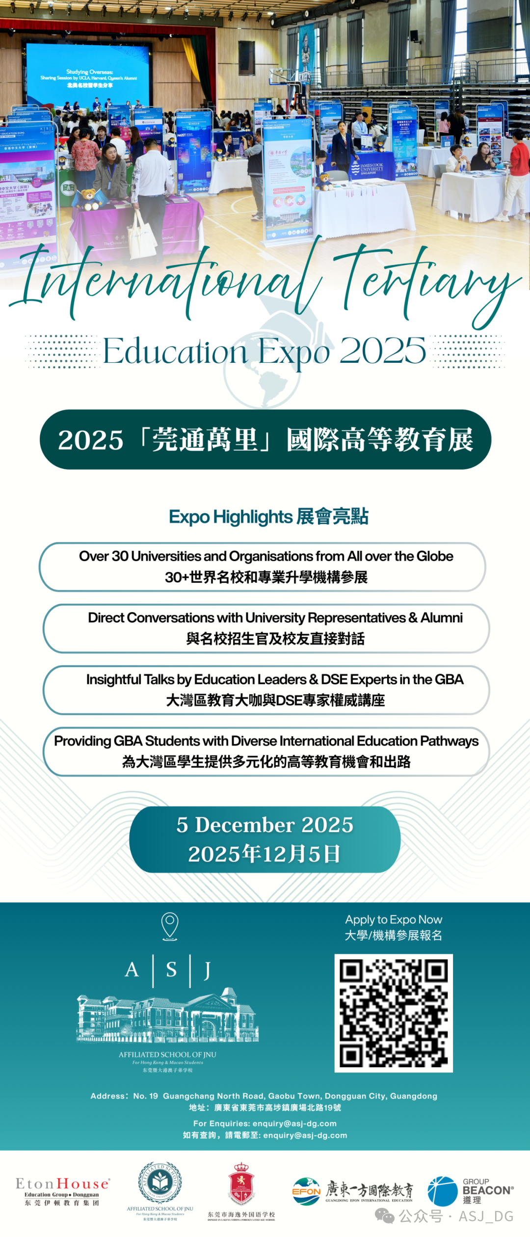 ASJ (Dongguan) is proud of hosting the 2025 International Tertiary Education Expo in Dongguan, organised by the Dongguan EtonHouse International Education Group. The Expo will take place on our campus on Friday, 5th December 2025, and we extend a warm invitation to higher education institutions worldwide that are qualified to admit students through the Joint Examination for Taiwanese, Hong Kong, and Macao Students and the Hong Kong Diploma of Secondary Education (HKDSE).