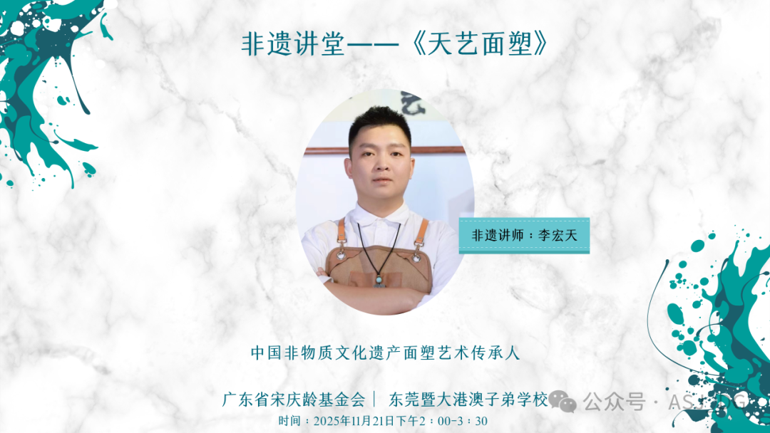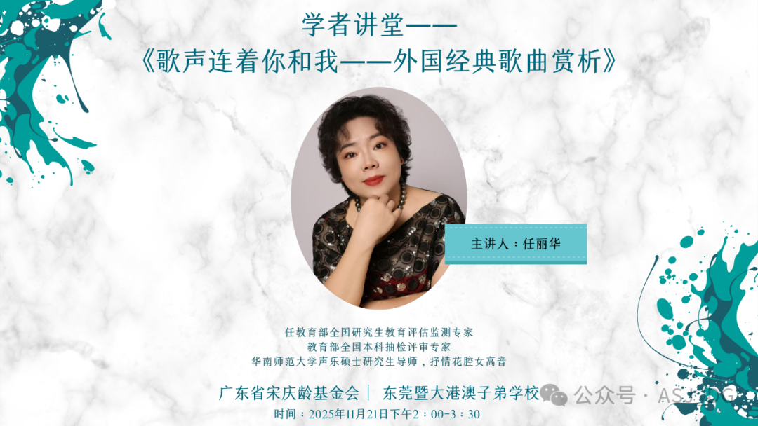 2025年11月21日,由广东省宋庆龄基金会主办的"美育公益课堂"在东莞暨大港澳子弟学校(东莞ASJ)圆满举行。本次活动精心设计了两大板块:特邀华南师范大学声乐硕士研究生导师、抒情花腔女高音歌唱家任丽华教授开展声乐讲座,并由中国非物质文化遗产面塑艺术传承人李宏天老师主持面塑体验工作坊。