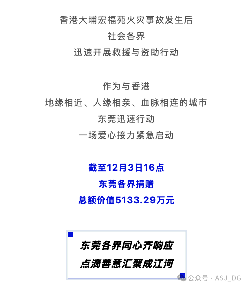 正如您可能已看到的,东莞——这座与香港有着深厚历史和亲缘联系的城市——迅速行动起来。全市多个机构发起了大型赈灾援助。我们谨此分享,据官方报道,东莞社会各界捐款总额已高达5133万元人民币。